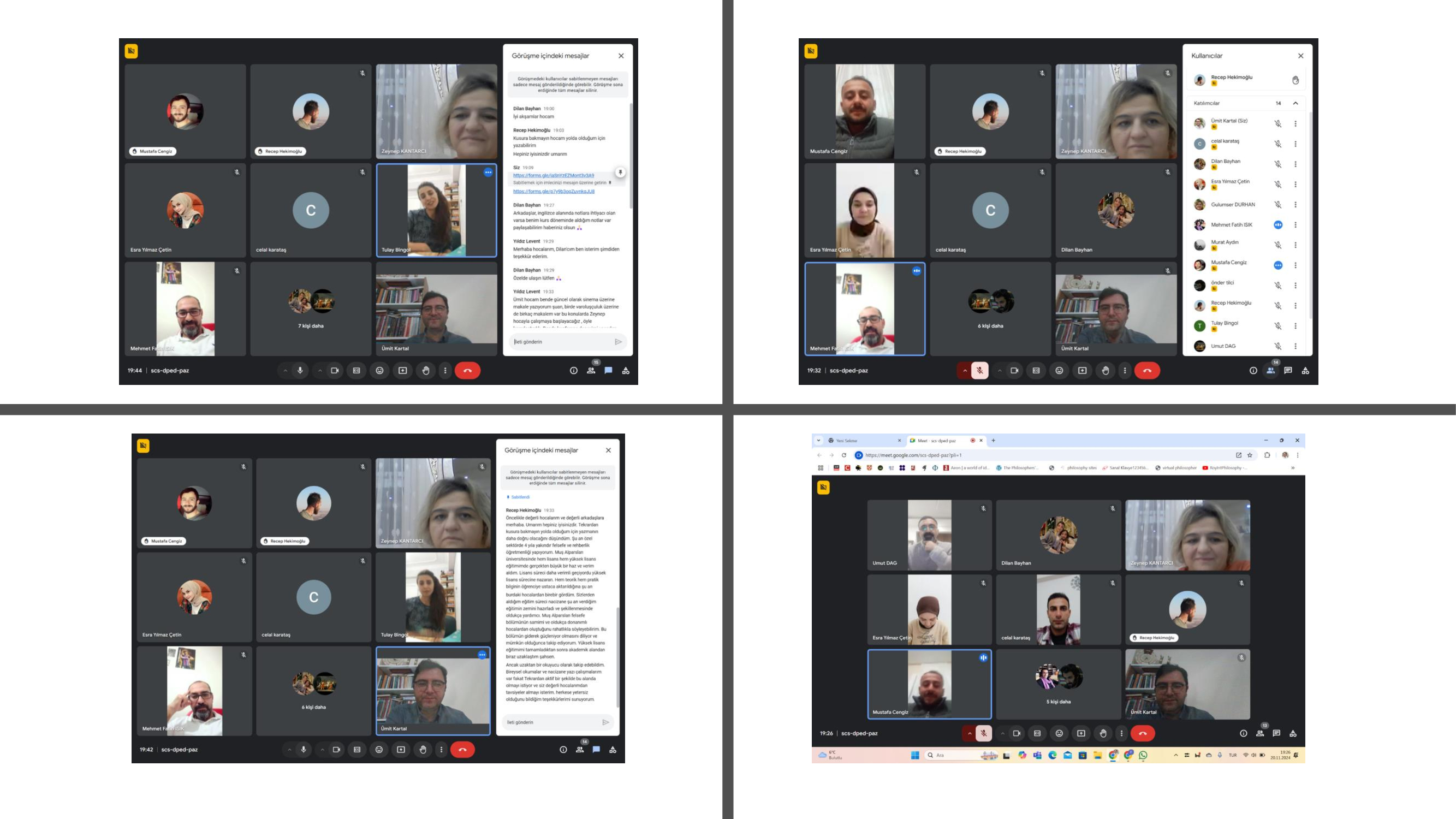 An online meeting was organized with our department graduates on November 20, 2024 at 19:00. In the meeting, first of all, the current health, education and work situations of our graduates were discussed. Then, our graduates were asked to evaluate various dimensions of the education they received at the Philosophy Department of the Social Sciences Institute of Muş Alparslan University. In this context, the opinions and suggestions of our graduate students regarding the curriculum, department and university were tried to be determined. It was emphasized that the meeting was very productive by the students and faculty members. The opinions and suggestions put forward at the meeting are as follows: